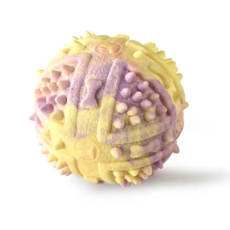pelota, diseñado para morder y entrenar. Diseño de colores mezclados amarillo y morado. Textura con bultos y puntas para ayudar con la limpieza dental. Resistente a las mordeduras. Ecológico.