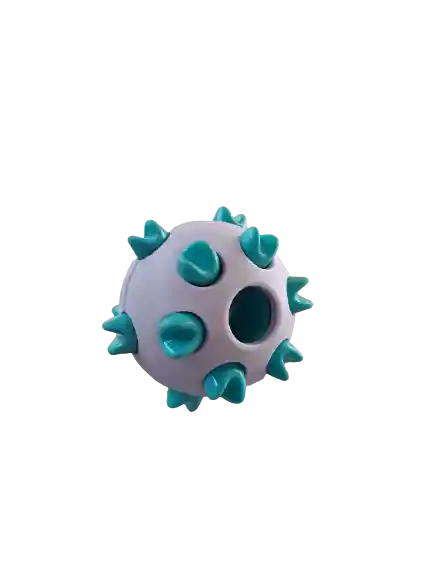 Pelota de caucho no toxico que permite a tu mascota jugar, alimentarse y tener una mejor higiene bucal . Por su diseño ayuda a que tu mascota se alimente de una manera mas lenta, limpie sus dientes mientra juega y se divierte