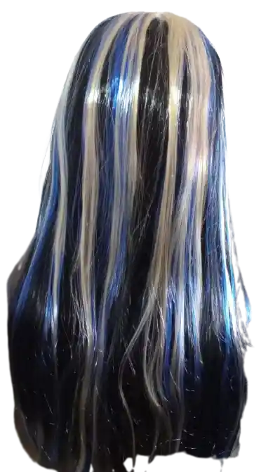 PELUCA NEGRA CON RAYOS AZUL Y MONO HALLOWEEN