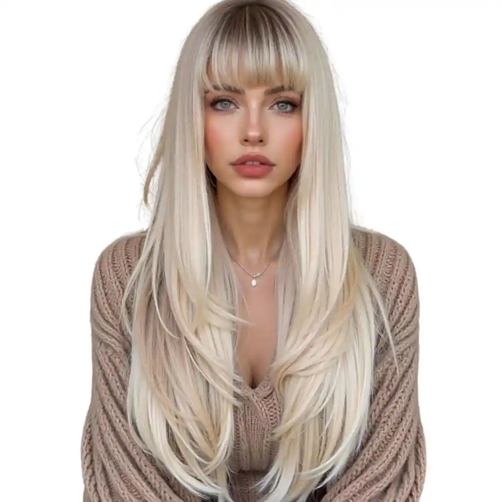 1 pieza Peluca sintética resistente al calor con efecto de raíces oscuras a dorado claro, cabello largo y liso, con capas, realista y natural, 26 pulgadas, material de fibra, adecuada para fiestas, vacaciones, cosplay, mujeres. OJO, planchar o rizar con temperatura baja.