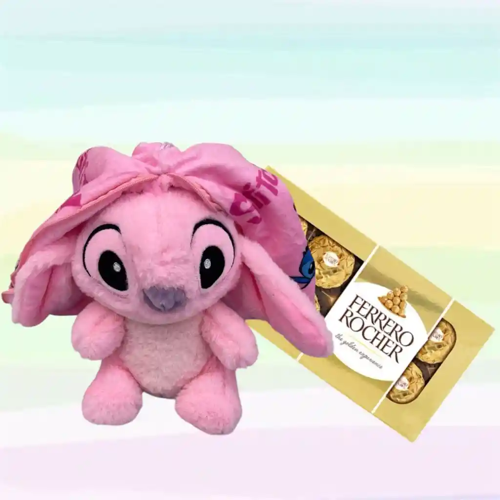 Una combinación que derrite corazones: el peluche de Angel, la dulce novia de Stitch, acompañado de una elegante caja de Ferrero Rocher. Un regalo tierno y delicioso, ideal para expresar tu amor, admiración o simplemente hacerle el día más especial a alguien que amas.