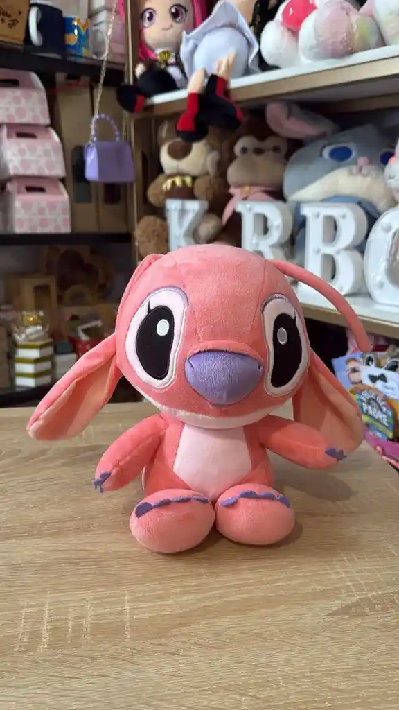 Peluche del personaje Angel de Disney. Color rosa vibrante con pecho y detalles en los ojos color rosa pálido. Posee antenas largas, nariz púrpura y garras de tela en pies y manos. Posición sentada. Felpa de poliéster ultra suave (soft plush) y relleno de algodón sintético hipoalergénico.