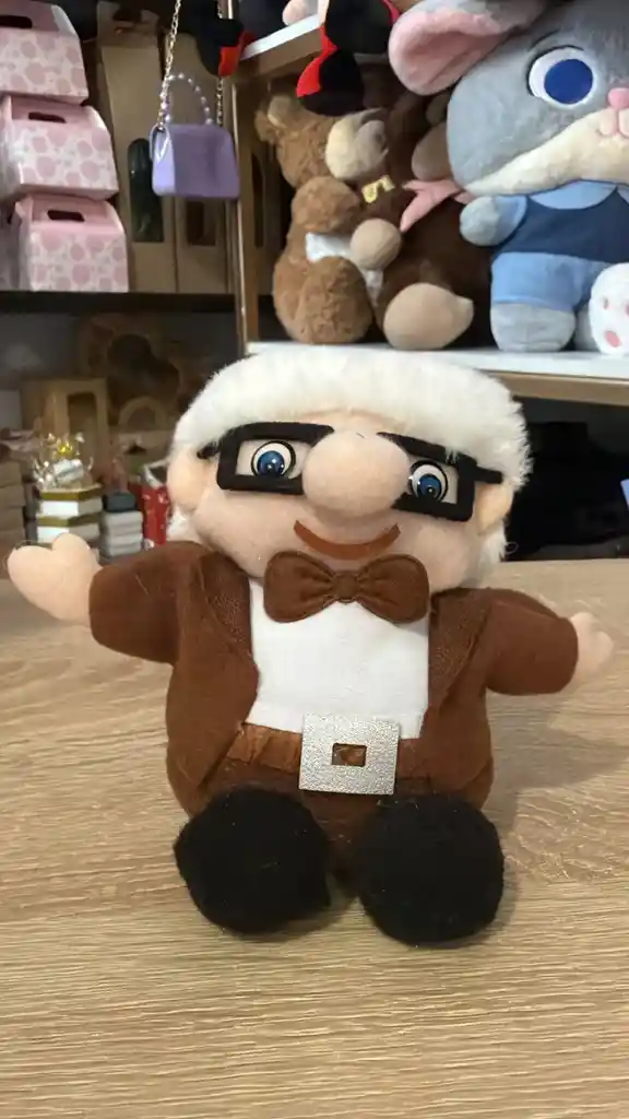 Peluche del personaje Carl de la película UP. Presenta cabello blanco de felpa larga, gafas negras de marco grueso, corbatín café y traje marrón con camisa blanca.