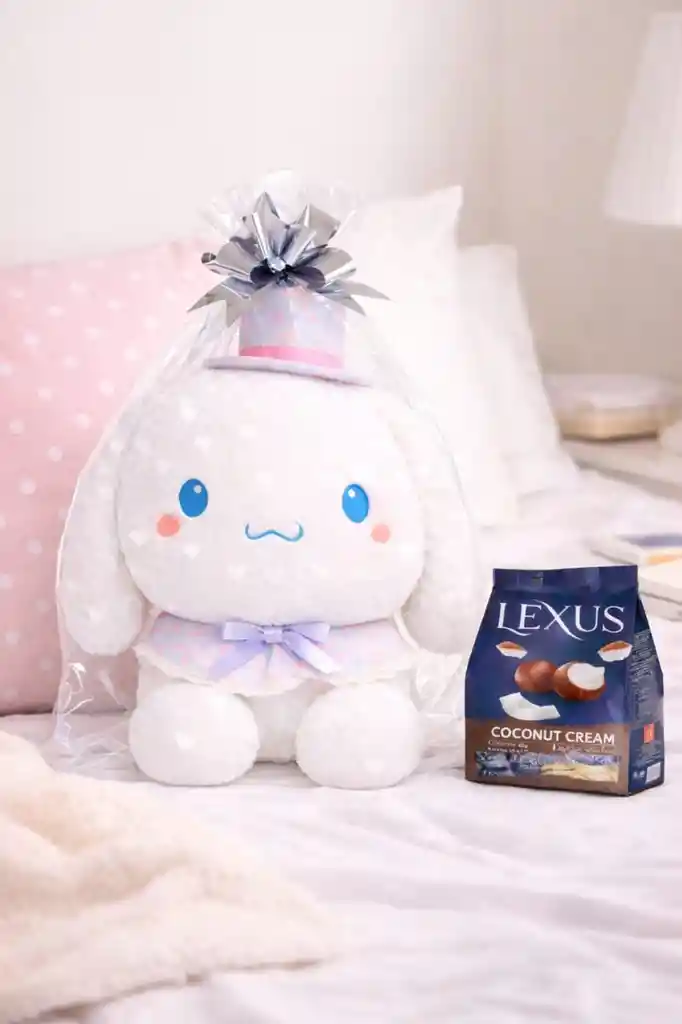 Sorprende con un regalo único, tierno y lleno de amor Este hermoso Peluche Cinnamoroll es la opción perfecta para cumpleaños, aniversarios o cualquier detalle especial. Su presentación tipo regalo lo hace aún más impactante desde el primer momento. Incluye una delicada bolsa transparente con corazones blancos y un elegante moño decorativo, listo para entregar sin necesidad de envolver. Además, viene acompañado de una deliciosa chocolatina para hacer el detalle aún más especial Incluye: ✔ 1 Peluche Cinnamoroll ✔ 1 Bolsa transparente con corazones blancos ✔ 1 Moño decorativo ✔ 1 Paquete Chocolates LEXUS COCONUT CREAM Medidas: Alto: 37 cm Ancho: 30 cm Características: ✔ Súper suave y esponjoso ✔ Diseño tierno y llamativo ✔ Ideal para regalar ✔ Presentación lista para sorprender Perfecto para: Cumpleaños, San Valentín, aniversarios o simplemente para alegrar el día de alguien especial. Importante: * Solo viene incluido lo que está en la descripción * El moño puede variar en el color * Otros elementos en las imágenes son solo decorativos