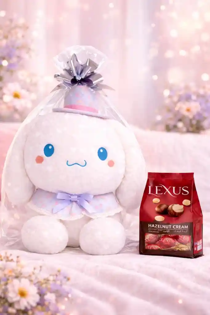 Sorprende con un regalo único, tierno y lleno de amor Este hermoso Peluche Cinnamoroll es la opción perfecta para cumpleaños, aniversarios o cualquier detalle especial. Su presentación tipo regalo lo hace aún más impactante desde el primer momento. Incluye una delicada bolsa transparente con corazones blancos y un elegante moño decorativo, listo para entregar sin necesidad de envolver. Además, viene acompañado de una deliciosa chocolatina para hacer el detalle aún más especial Incluye: ✔ 1 Peluche Cinnamoroll ✔ 1 Bolsa transparente con corazones blancos ✔ 1 Moño decorativo ✔ 1 Paquete Chocolates LEXUS HAZELNUT CREAM Medidas: Alto: 37 cm Ancho: 30 cm Características: ✔ Súper suave y esponjoso ✔ Diseño tierno y llamativo ✔ Ideal para regalar ✔ Presentación lista para sorprender Perfecto para: Cumpleaños, San Valentín, aniversarios o simplemente para alegrar el día de alguien especial. Importante: * Solo viene incluido lo que está en la descripción * El moño puede variar en el color * Otros elementos en las imágenes son solo decorativos