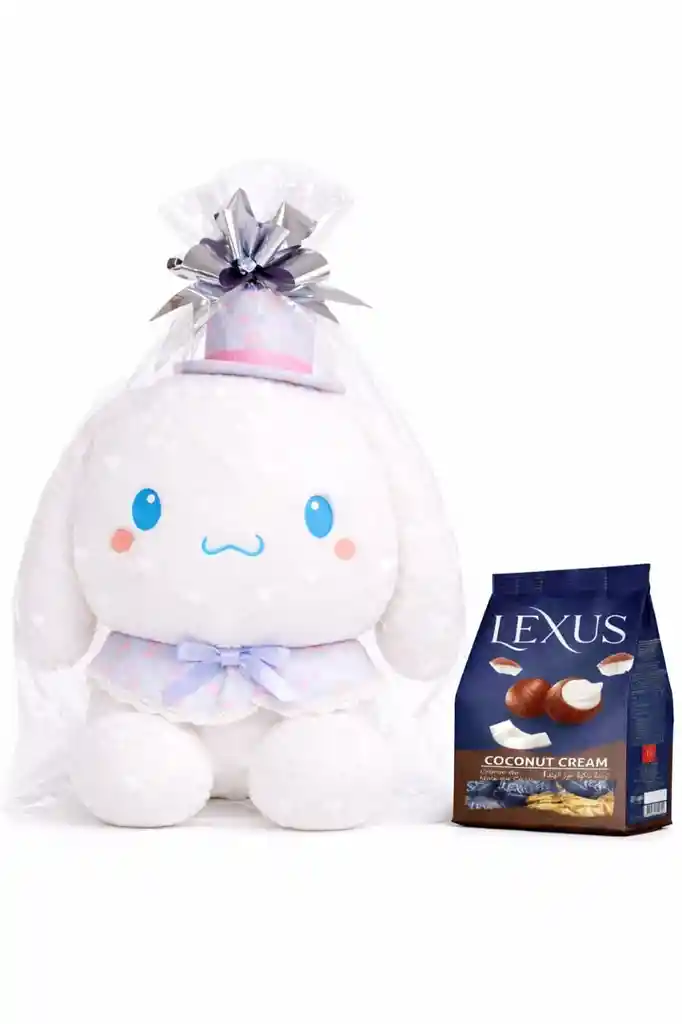 Sorprende con un regalo único, tierno y lleno de amor Este hermoso Peluche Cinnamoroll es la opción perfecta para cumpleaños, aniversarios o cualquier detalle especial. Su presentación tipo regalo lo hace aún más impactante desde el primer momento. Incluye una delicada bolsa transparente con corazones blancos y un elegante moño decorativo, listo para entregar sin necesidad de envolver. Además, viene acompañado de una deliciosa chocolatina para hacer el detalle aún más especial Incluye: ✔ 1 Peluche Cinnamoroll ✔ 1 Bolsa transparente con corazones blancos ✔ 1 Moño decorativo ✔ 1 Paquete Chocolates LEXUS COCONUT CREAM Medidas: Alto: 37 cm Ancho: 30 cm Características: ✔ Súper suave y esponjoso ✔ Diseño tierno y llamativo ✔ Ideal para regalar ✔ Presentación lista para sorprender Perfecto para: Cumpleaños, San Valentín, aniversarios o simplemente para alegrar el día de alguien especial. Importante: * Solo viene incluido lo que está en la descripción * El moño puede variar en el color * Otros elementos en las imágenes son solo decorativos