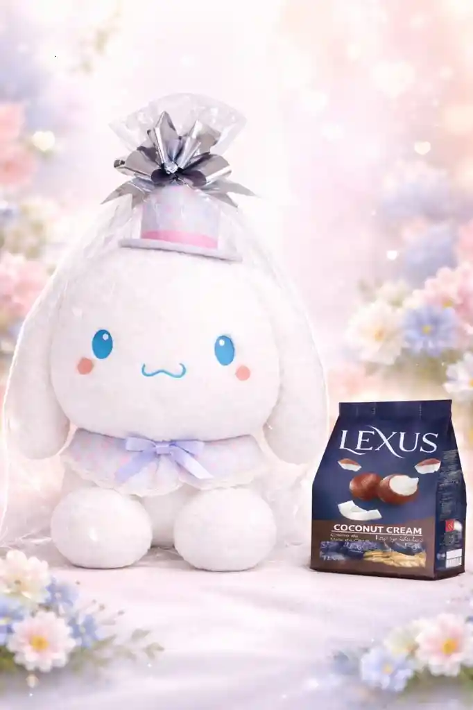 Sorprende con un regalo único, tierno y lleno de amor Este hermoso Peluche Cinnamoroll es la opción perfecta para cumpleaños, aniversarios o cualquier detalle especial. Su presentación tipo regalo lo hace aún más impactante desde el primer momento. Incluye una delicada bolsa transparente con corazones blancos y un elegante moño decorativo, listo para entregar sin necesidad de envolver. Además, viene acompañado de una deliciosa chocolatina para hacer el detalle aún más especial Incluye: ✔ 1 Peluche Cinnamoroll ✔ 1 Bolsa transparente con corazones blancos ✔ 1 Moño decorativo ✔ 1 Paquete Chocolates LEXUS COCONUT CREAM Medidas: Alto: 37 cm Ancho: 30 cm Características: ✔ Súper suave y esponjoso ✔ Diseño tierno y llamativo ✔ Ideal para regalar ✔ Presentación lista para sorprender Perfecto para: Cumpleaños, San Valentín, aniversarios o simplemente para alegrar el día de alguien especial. Importante: * Solo viene incluido lo que está en la descripción * El moño puede variar en el color * Otros elementos en las imágenes son solo decorativos