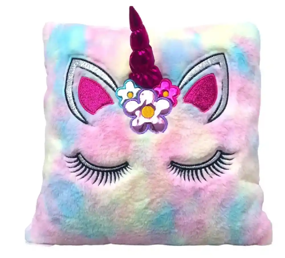 Lindo Peluche Cojin de Unicornio Tonos Pastel Orejas Escarchadas. El detalle ideal para obsequiar. Su medida es 35 x 35 cm.