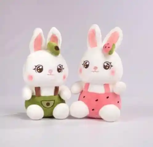 Estos dos peluches son conejitos adorables y muy tiernos, diseñados con un estilo dulce y infantil. Ambos son de color blanco, con ojos grandes y brillantes, mejillas rosadas y una expresión amable que transmite ternura y calidez. El conejito de la izquierda lleva un overol verde con detalles que recuerdan a un kiwi, incluyendo un pequeño adorno en la cabeza. El conejito de la derecha viste un overol rosado inspirado en una sandía, también con un detalle a juego sobre la oreja. Sus orejas largas con interior rosado, sus patitas redondeadas y su textura suave los hacen ideales para abrazar, decorar habitaciones infantiles o regalar en ocasiones especiales. ✨ Cada peluche se vende por separado, permitiendo elegir el diseño que más te guste o adquirir ambos individualmente. 🐰