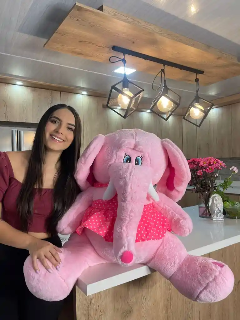 Hermoso peluche de elefante rosado grande con una medida de 1,35 metros de longitud completa aproximada. Tiene un hermoso pelaje extra suave Nuestros peluches son fabricados con materiales de primera calidad, relleno de algodón siliconado antialergico suave que no se deforma ni endurece con el tiempo y brinda sensación de suavidad al tacto.