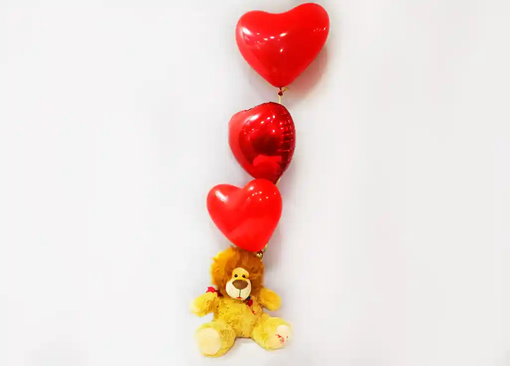 ESTE INCREÍBLE ARREGLO INCLUYE: 1 PELUCHE DE LEÓN DE 38CM CON 2 GLOBOS R12 CON HELIO CERTIFICADO 4 DÍAS DE FLOTACIÓN Y 1 GLOBO METALIZADO CON HELIO.