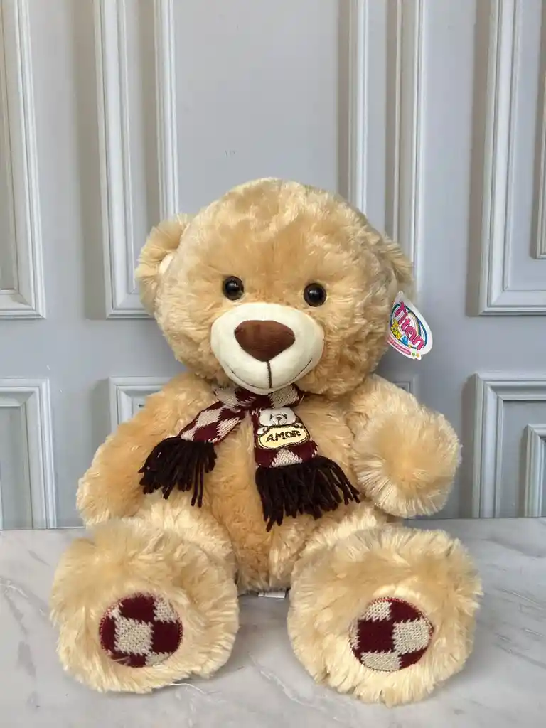 Peluche de Oso de color café claro con Bufanda vinotinto, bordada con la palabra "Amor", de un tamaño aproximado de 30 cm. Pidelo con mensaje personalizado!