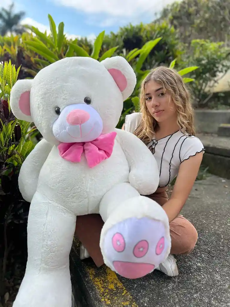 Hermoso peluche de oso patas largas Grande con una medida de 1,40 metros de longitud completa aproximada. Tiene un hermoso pelaje extra suave Nuestros peluches son fabricados con materiales de primera calidad, relleno de algodón siliconado antialergico suave que no se deforma ni endurece con el tiempo y brinda sensación de suavidad al tacto.
