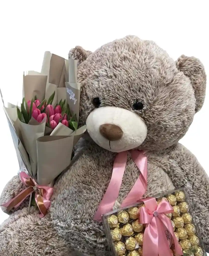 Peluche de gran tamaño acompañado de una elegante caja de chocolates y un arreglo floral delicado de tulipanes . Un regalo completo que combina ternura, dulzura y romanticismo para sorprender en ocasiones especiales. El producto puede ser sustituido dependiendo la disponibilidad “Mensaje Personalizado” máximo de 30 caracteres (Dejar el mensaje en el chat, los comentarios no se previsualizan para la tienda por lo que si se dejan allí no podrá ser incluido).