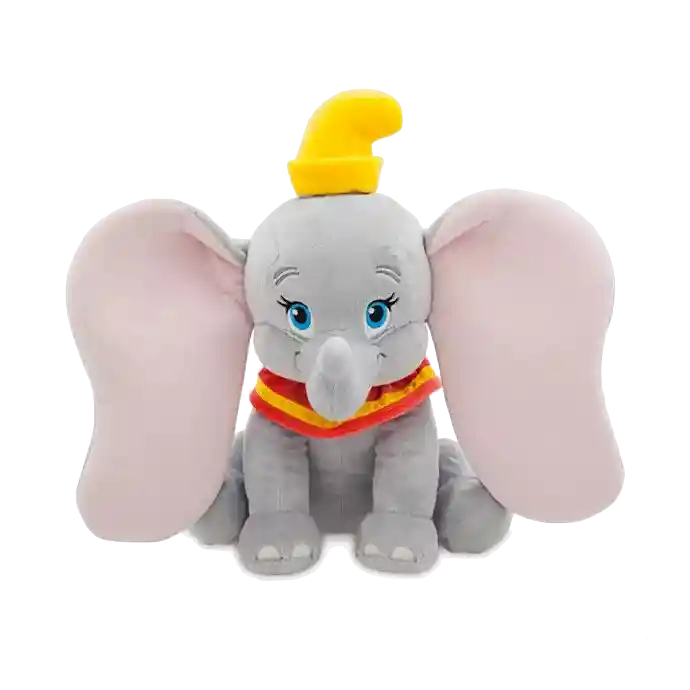 Peluche del personaje Dumbo ORIGINAL Disney Store. Escultura de peluche detallada, características bordadas, cuello de payaso de terciopelo con ribete satinado, sombrero acolchado de payaso, orejas grandes, cola, relleno súper suave. Producto fabricado en fibra de poliéster. Tamaño: 14"
