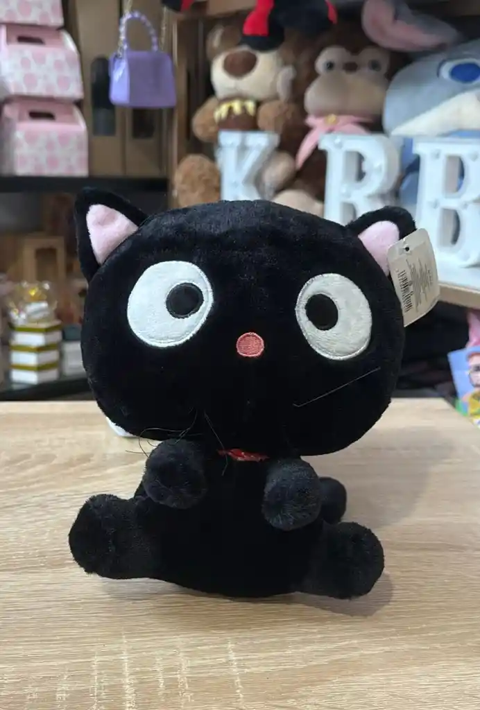 Peluche del personaje Chococat de Sanrio en color negro. Cabeza de gran tamaño con ojos blancos circulares, nariz rosada y orejas con interior rosado. Incluye collar rojo con puntos blancos y bigotes de hilo negro. Felpa corta de poliéster ultra suave y relleno de algodón sintético.
