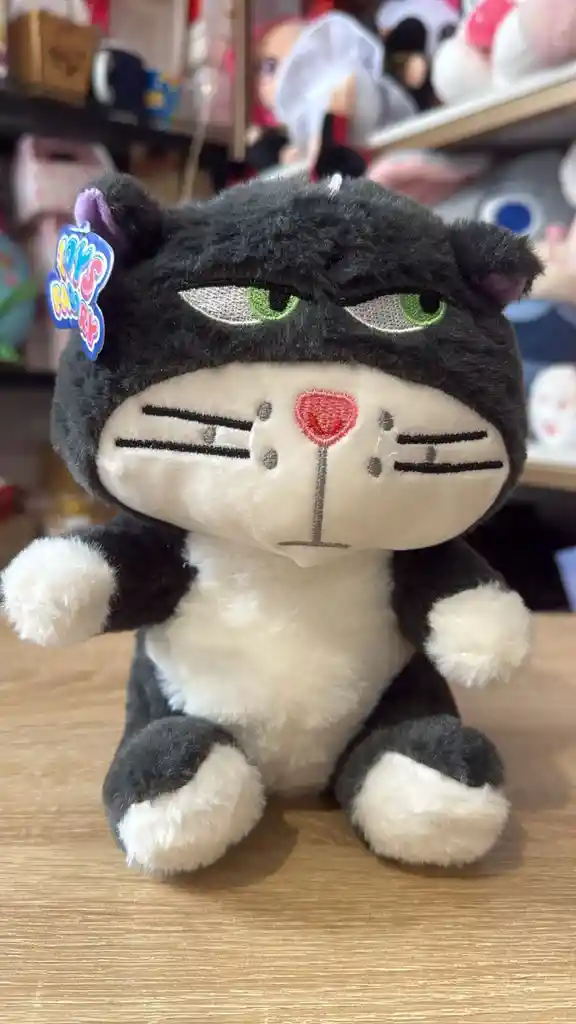 Peluche de gato en posición sentada con pelaje bicolor (negro en el cuerpo y cabeza, blanco en el pecho y patas). Presenta una expresión facial de desagrado o "grumpy" con ojos verdes entornados bordados, nariz rosada en forma de corazón y bigotes negros marcados. Felpa de poliéster de fibra media (textura esponjosa) y relleno de algodón siliconado.
