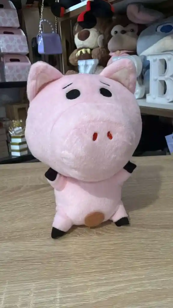 Peluche del personaje Hamm de Toy Story. Diseño de alcancía de cerdo color rosa claro, con cejas inclinadas, ojos negros pequeños y hocico prominente con dos puntos rojos. Posee patas cortas de color negro y un detalle circular café en la parte inferior del vientre que simula el tapón. Felpa suave de poliéster y relleno de algodón sintético hipoalergénico.