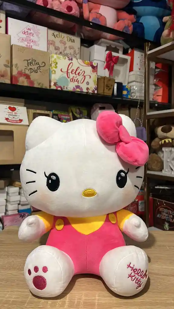 Peluche de Hello Kitty con su vestimenta clásica de jardinera en color rosa vibrante y camiseta amarilla. Incluye su emblemático lazo rosa en la oreja izquierda y detalles bordados de alta precisión en el rostro. Destaca por tener una huella de patita bordada en una planta del pie y el nombre "Hello Kitty" en la otra. Felpa de pelo corto extra suave (Velboa), detalles bordados en hilo de seda, lazo de tela aterciopelada y relleno de algodón siliconado premium.