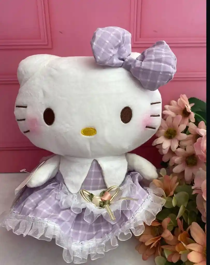 Hermosa muñeca Hello Kitty con delicado vestido en tono lila y moño a juego. Elaborada en material extra suave y con detalles finos que la hacen perfecta para regalar o decorar espacios especiales. 📏 Medidas: Alto: 18 cm Ancho: 17 cm Largo (profundidad): 10 cm (Las medidas pueden variar ligeramente.) 💜 Características: Tela suave y acolchada Vestido con acabados delicados y detalles decorativos Tamaño ideal para detalles y anchetas Perfecta para niñas y amantes de Hello Kitty 🎁 Ideal para: Cumpleaños, detalles románticos, regalos infantiles o complemento de arreglos especiales. ⚠️ Los tonos y accesorios pueden variar ligeramente según disponibilidad. Un detalle encantador y femenino que enamora a primera vista 🎀✨