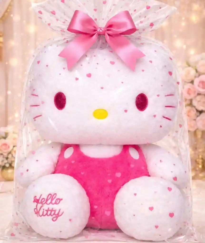 Sorprende con un regalo tierno, elegante y listo para entregar. Este hermoso peluche de Hello Kitty viene presentado en una delicada bolsa transparente con corazones y moño, ideal para ocasiones especiales. Su tamaño grande y acabado suave lo convierten en un detalle perfecto para cumpleaños, aniversarios o simplemente para expresar cariño. Medidas: •Alto: 43 cm •Ancho: 41 cm Incluye: •1 Peluche Hello Kitty •1 Bolsa de regalo transparente con corazones •1 Moño decorativo Importante: Solo incluye lo mencionado en la descripción. Los demás accesorios que aparecen en la imagen son únicamente para ambientar y no están incluidos. Ideal para: Regalos sorpresa Decoración Detalles románticos o especiales