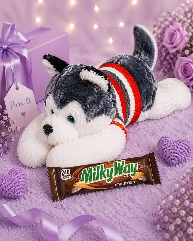 Sorprende con un regalo tierno, elegante y listo para entregar. Este hermoso peluche tipo husky destaca por su suavidad, diseño adorable y excelente tamaño, ideal para ocasiones especiales como cumpleaños, aniversarios o detalles románticos. Incluye una presentación especial que lo hace aún más atractivo: bolsa de regalo transparente con estrellas y un delicado moño decorativo, perfecto para regalar sin necesidad de envoltura adicional. Medidas del peluche: * Largo: 56 cm * Ancho: 25 cm * Alto: 20 cm Incluye: * 1 Peluche * 1 Moño * 1 Bolsa de regalo transparente con estrellas. * 1 Chocolatina Milkyway Importante: Este producto solo incluye lo que está descrito anteriormente. Los demás accesorios que aparecen en las imágenes son únicamente para ambientar y decorar la presentación.