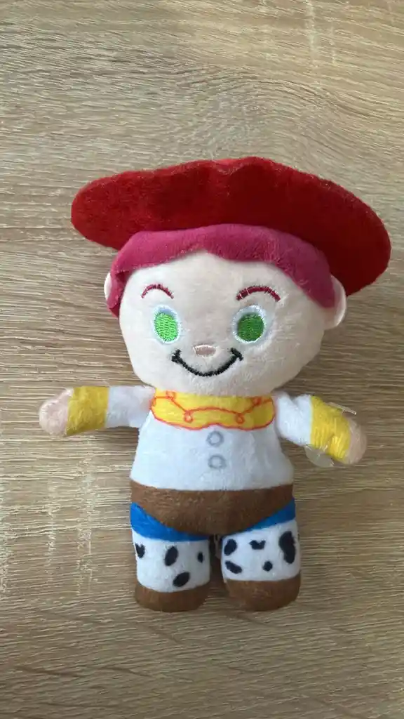 Peluche pequeño de Jessie la vaquerita. Presenta cabello fucsia, sombrero rojo grande, ojos verdes bordados y su atuendo clásico de camisa blanca con detalles amarillos y pantalones con estampado de vaca.