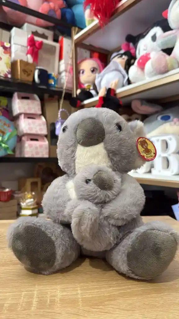 Peluche de koala sentado en color gris con pecho blanco. Incluye una cría de koala (bebé) adherida a los brazos frontales. Narices en contraste color gris oscuro y ojos negros. Incluye etiqueta de marca circular. Felpa suave de pelo medio y relleno de algodón sintético de alta densidad.