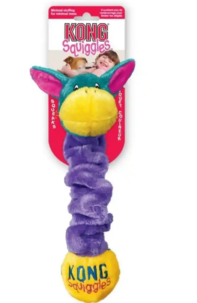 Juguete para perros de la marca americana Kong , este simpático personaje se estira, es sonoro su tamaño es pequeño7,8 pulgadas largo aproximadamente, Los KONG Squiggles son juguetes elásticos, flexibles y sonoros que ofrecen diversión tanto a los perros como a sus dueños. Estos vistosos juguetes incorporan un cuerpo largo y elástico, además de chirriadores en ambos extremos, agítelo, estírelo y hágalo sonar,relleno mínimo para el mínimo desorden, materiales no tóxicos de calidad,gran diversión interactiva.