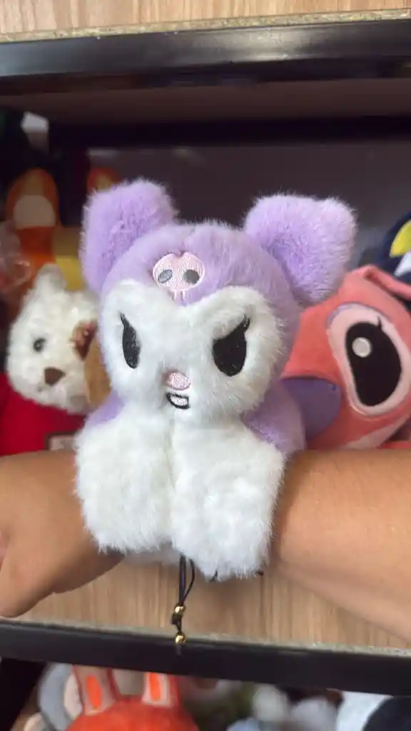 Peluche funcional de Kuromi diseñado como accesorio para la muñeca. Presenta pelaje lila y blanco de textura larga, ojos negros bordados y el icónico cráneo rosa en la frente. Sus extremidades se envuelven para sujetarse a superficies.