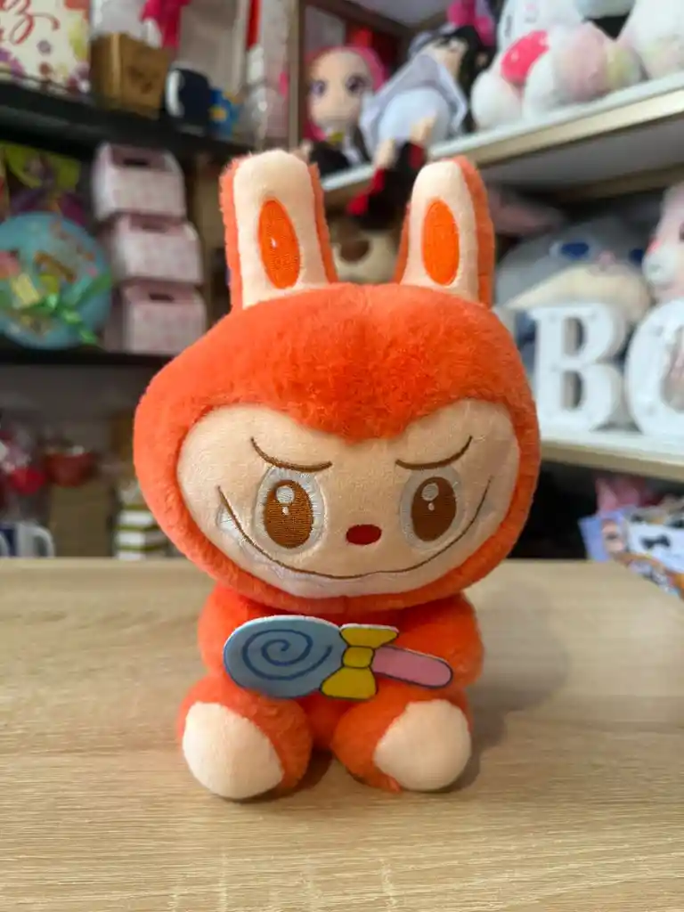 Peluche de conejo color naranja vibrante con textura rizada. Rostro bordado con ojos grandes color miel, nariz roja y una amplia sonrisa. Sostiene una paleta de dulce (lollipop) de fieltro color azul con moño amarillo. Orejas largas con interior naranja brillante. Felpa rizada de poliéster, detalles en fieltro y relleno de algodón sintético.