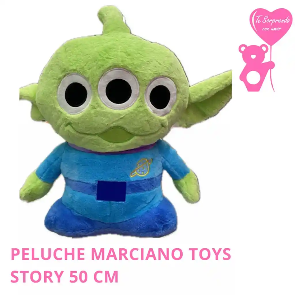 Peluche Marciano Toy Story 50 cm, inspirado en los icónicos alienígenas verdes de la película de Disney Pixar, ideal para fans y coleccionistas. Confeccionado en felpa suave y de excelente calidad, es perfecto para decorar, abrazar o regalar. Su tamaño de 50 cm lo hace especial y llamativo, con detalles auténticos que representan fielmente al personaje.