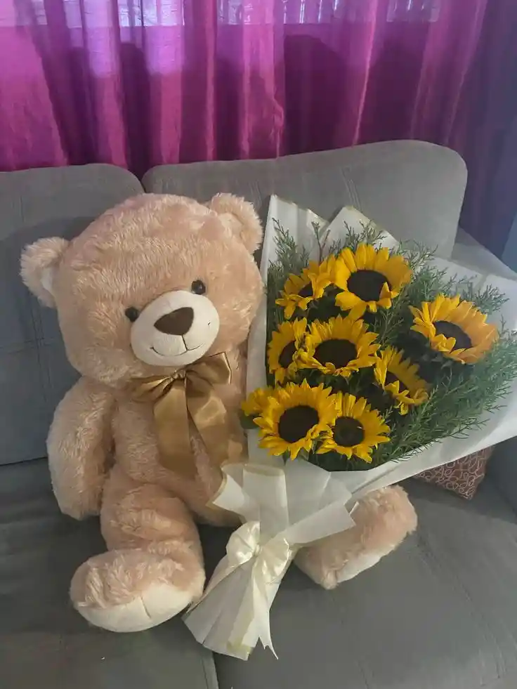 hermoso arreglo floral de girasoles con peluche grande de aproximadamente 50 cm a 60 cm ( oso varia segun inventario de la tienda pero te llega tamaño aproximado indicado )
