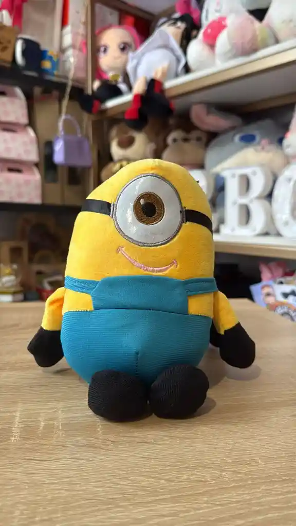 Peluche del personaje Stuart de Mi Villano Favorito / Minions. Diseño cilíndrico amarillo con un solo ojo central, gafa plateada bordada y expresión sonriente. Viste su clásico overol azul de tela texturizada y guantes negros.