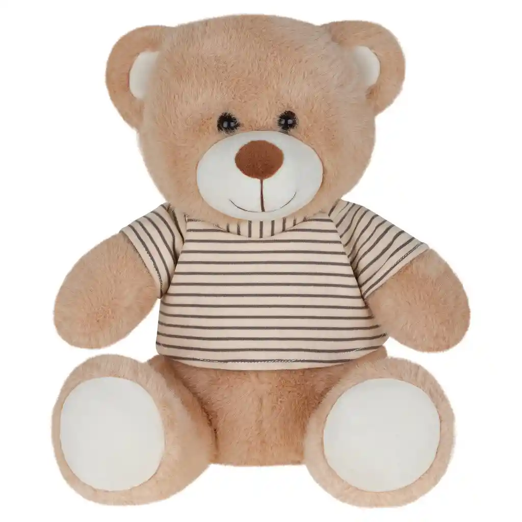Tierno oso de peluche Teddy con un estilo clásico y acogedor, luciendo una linda camiseta a rayas en tonos neutros. Su textura esponjosa y su mirada dulce lo convierten en el compañero perfecto para brindar calidez y alegría en cualquier ocasión. 📏 Medidas: Alto: 24 cm Ancho: 17 cm Largo (profundidad): 16 cm (Las medidas pueden variar ligeramente.) 🧸 Características: Material de felpa premium, extremadamente suave al tacto. Vestido con una camiseta de tela suave con diseño de rayas horizontales. Detalles bordados de alta calidad y hocico contrastado. Relleno acolchado que mantiene su forma, ideal para abrazos interminables. 🎁 Ideal para: Sorpresas románticas, regalos de Baby Shower, cumpleaños o como un tierno detalle para decorar habitaciones infantiles. ⚠️ Los tonos y accesorios pueden variar ligeramente según disponibilidad. ¡Un clásico lleno de ternura que siempre saca una sonrisa! 🐻✨