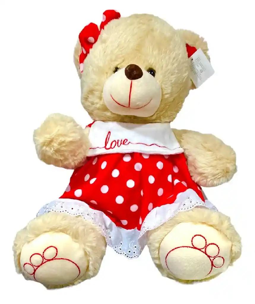 Hermoso Peluche Oso con Vestido rojo Mide 35 Cm de alto. Dice te amo al oprimir su patica izquierda Ref 1251-35. Es antialérgico, no se deforma ni se endurece con el tiempo y brinda la mejor sensación de suavidad y finura al tacto