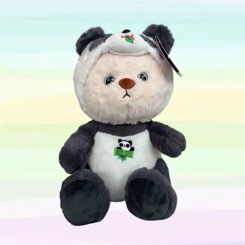Un peluche de oso suave y esponjoso, vestido con un disfraz de panda blanco y negro que cubre todo su cuerpo, con orejas redondeadas y detalles que imitan el pelaje del panda, dándole un toque adorable y divertido.