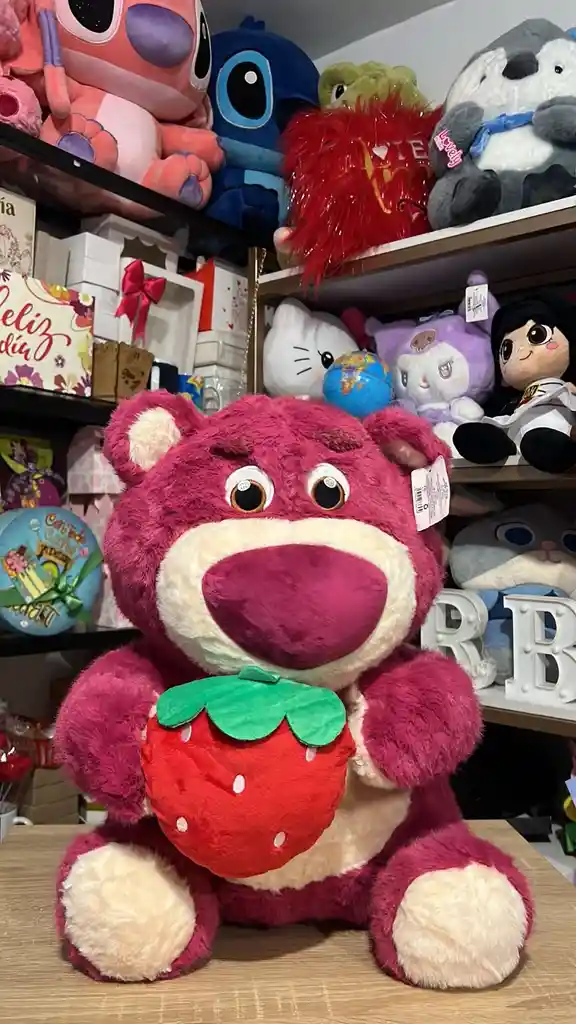 Peluche de gran tamaño del personaje Lotso en color magenta vibrante. Presenta el hocico, cejas y plantas de las patas en color crema. Sostiene una fresa roja de felpa con hojas verdes de gran tamaño entre sus manos. Incluye etiqueta de autenticidad en la oreja. Felpa de pelo medio de alta densidad (Textura Extra Soft), detalles en bordado de alta definición y relleno de algodón siliconado de gran volumen.