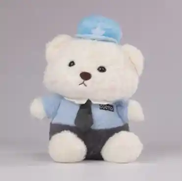 Primer plano muy detallado de un peluche de oso blanco, textura suave y esponjosa claramente visible, con costuras finas y bien definidas. El oso viste un uniforme azul claro con una pequeña gorra a juego, camisa azul pastel y corbata gris oscura. Sus ojos negros brillantes reflejan la luz suavemente, nariz pequeña marrón y mejillas ligeramente rosadas que transmiten ternura. Iluminación de estudio suave, fondo neutro claro, enfoque nítido en el rostro y el torso, estilo fotografía de producto de alta calidad, ultra alta resolución, sensación limpia y fresca.