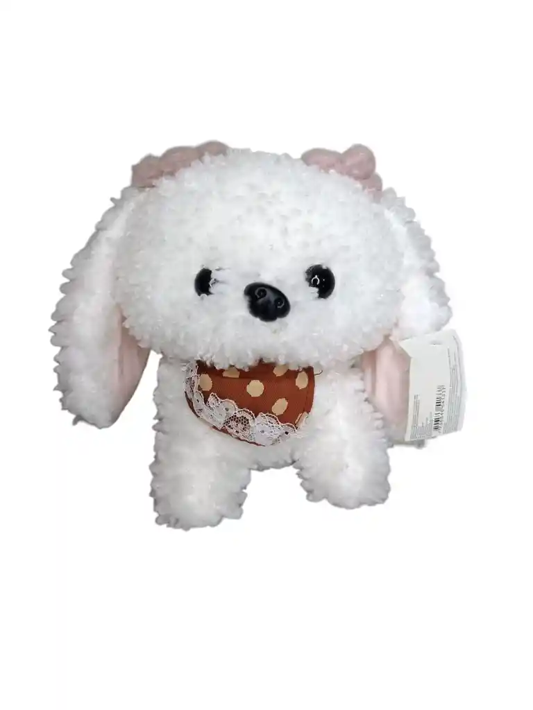 Peluche perro crespo color blanco orejas largas 100% poliéster material antialérgico medidas 20 cm de alto por 20 cm de ancho