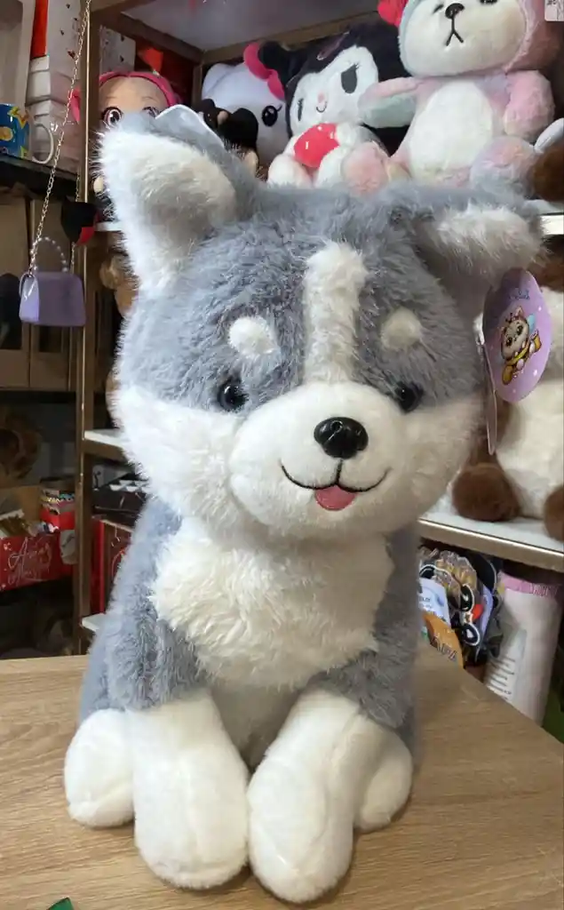 Peluche de perro raza Husky en posición sentada. Presenta pelaje bicolor: gris en la parte superior de la cabeza, espalda y orejas, y blanco en el rostro, pecho y patas delanteras. Tiene ojos negros, una pequeña lengua rosada asomando y cejas blancas circulares. Incluye una etiqueta decorativa morada en la oreja. Felpa de poliéster de fibra larga (textura esponjosa) y relleno de algodón siliconado hipoalergénico.