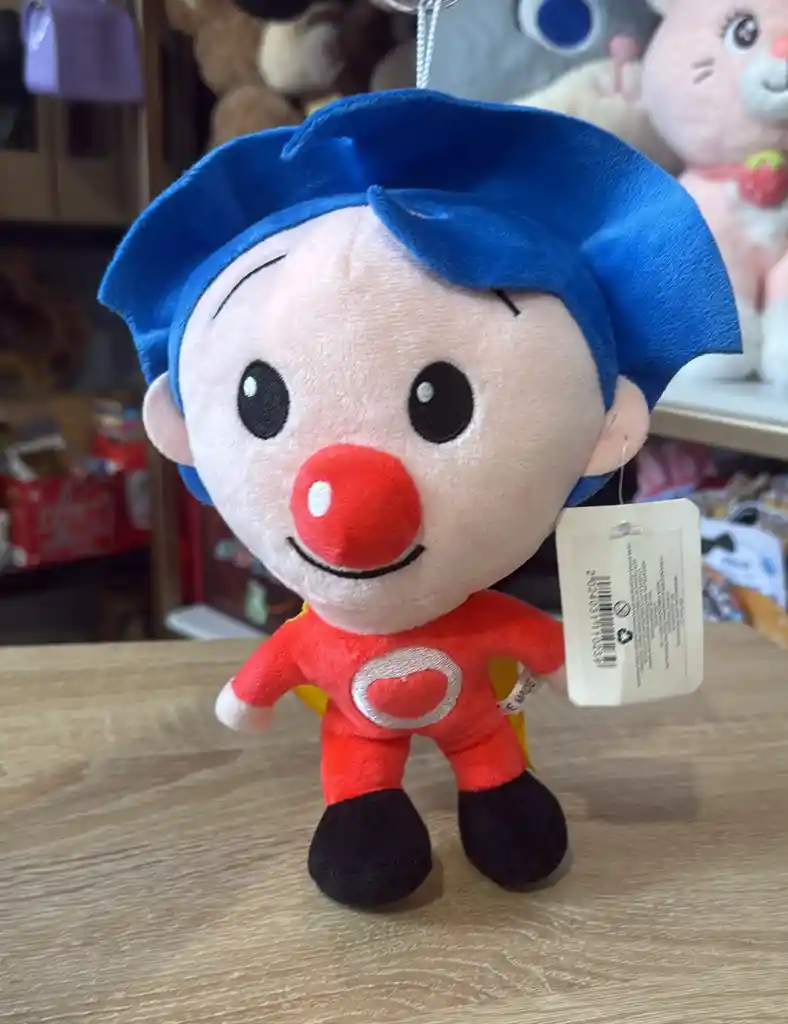 Peluche del personaje Plim Plim de pie. Viste su traje rojo característico con un corazón blanco y rojo en el pecho, zapatos negros y una capa amarilla en la espalda. El rostro presenta una nariz roja grande y redonda, ojos negros circulares y su distintivo cabello azul en forma de punta hacia adelante.