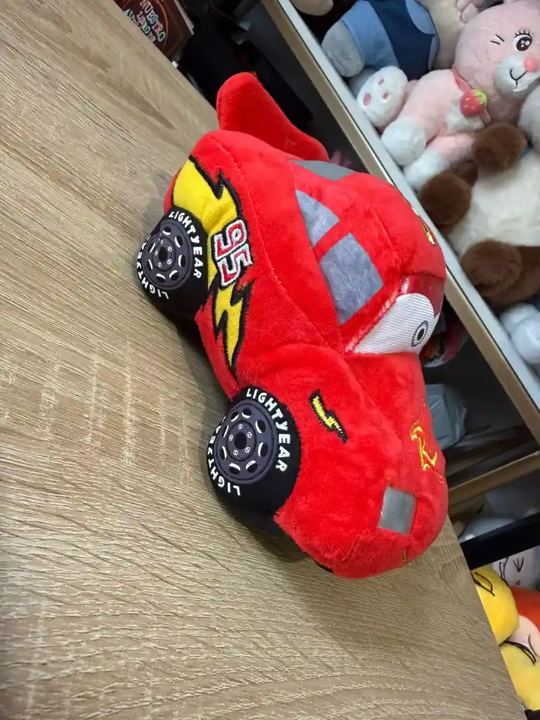 Peluche con la forma del auto de carreras Rayo McQueen. De color rojo vibrante, presenta detalles bordados como el número "95" con un rayo amarillo en los laterales, el logo de "Rust-eze" en el capó y llantas negras con el texto "Lightyear". Los ojos están integrados en el parabrisas.