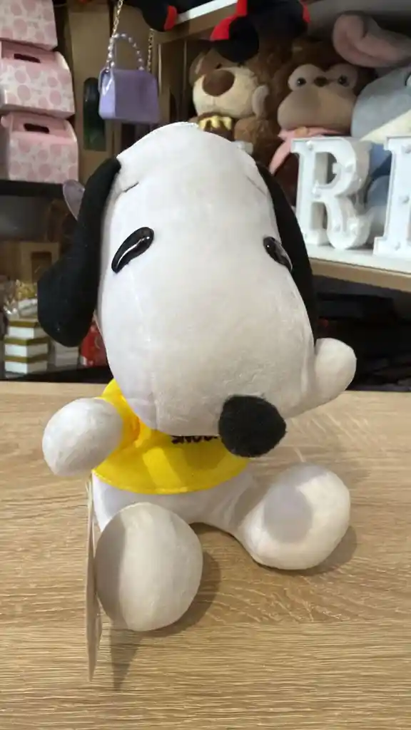 Peluche del personaje Snoopy en posición sentada. Cuerpo de color blanco con sus características orejas largas y caídas en color negro, además de su nariz negra prominente. Viste una camiseta de tela amarilla con el nombre "SNOOPY" estampado en el pecho. Ojos negros bordados en forma de arco. Felpa suave de poliéster (tipo terciopelo corto) y relleno de algodón siliconado.