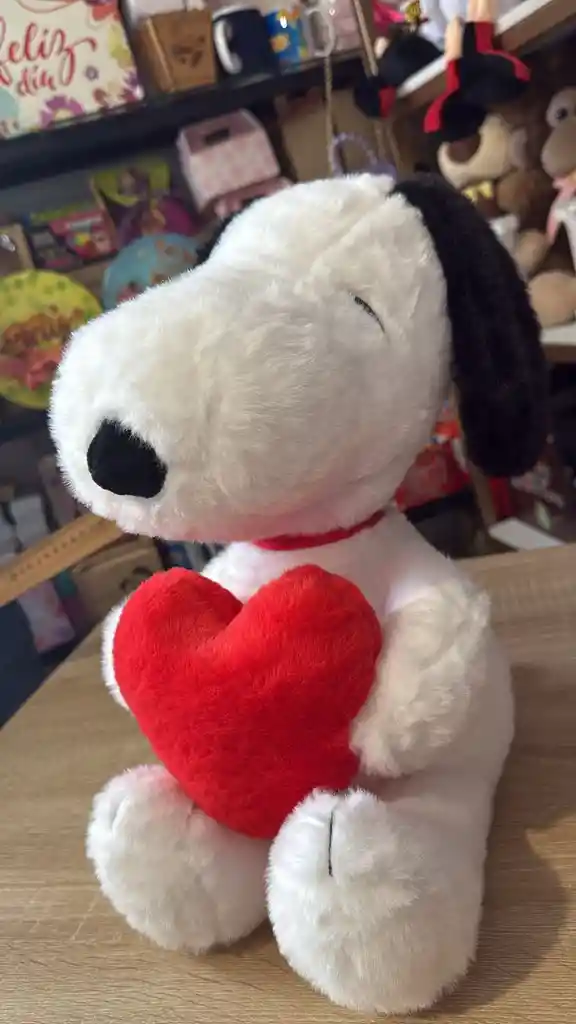 Peluche del personaje Snoopy en posición sentada. Cuerpo de color blanco con orejas negras largas y caídas. Sostiene un corazón de peluche color rojo vibrante entre sus manos. Ojos cerrados bordados, nariz negra prominente y collar rojo delgado. Felpa suave de poliéster de alta calidad y relleno de algodón sintético premium.