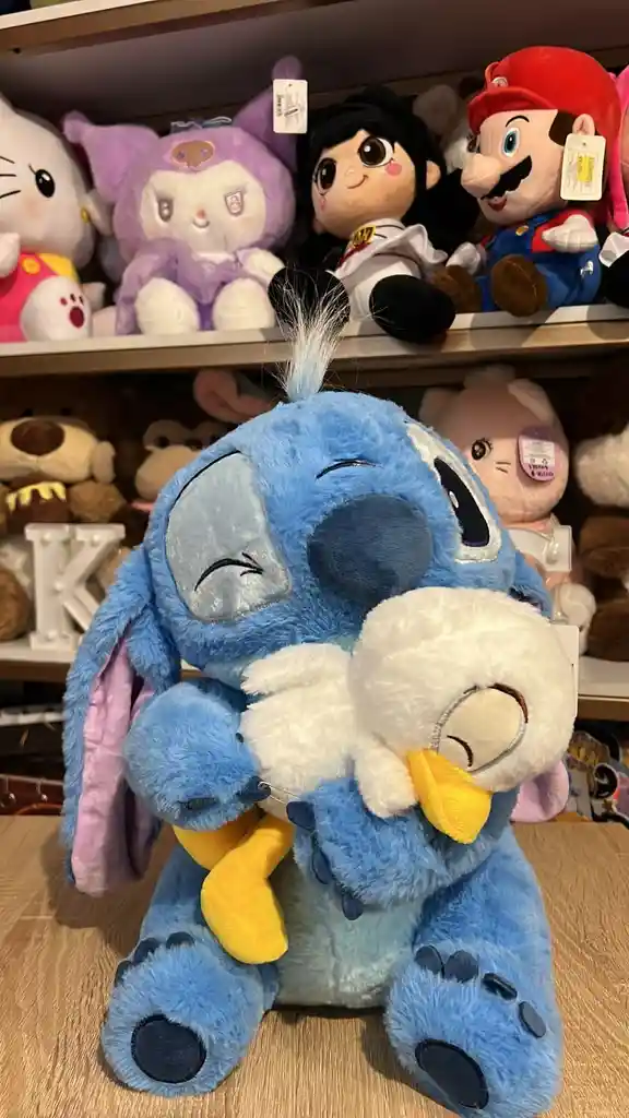 Peluche premium. Altura 35cm Stitch azul clásico sosteniendo un patito blanco con pico amarillo un ojo está bordado como cerrado (guiño/ternura) mechón de pelo azul claro en la parte superior. Felpa de alta calidad con relleno siliconado.