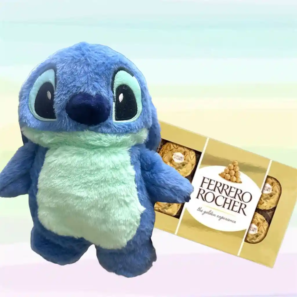 Peluche Stitch con bolsita de agua caliente más paquete de 8 Ferrero Rocher. Ideal para consentir y dar calidez.