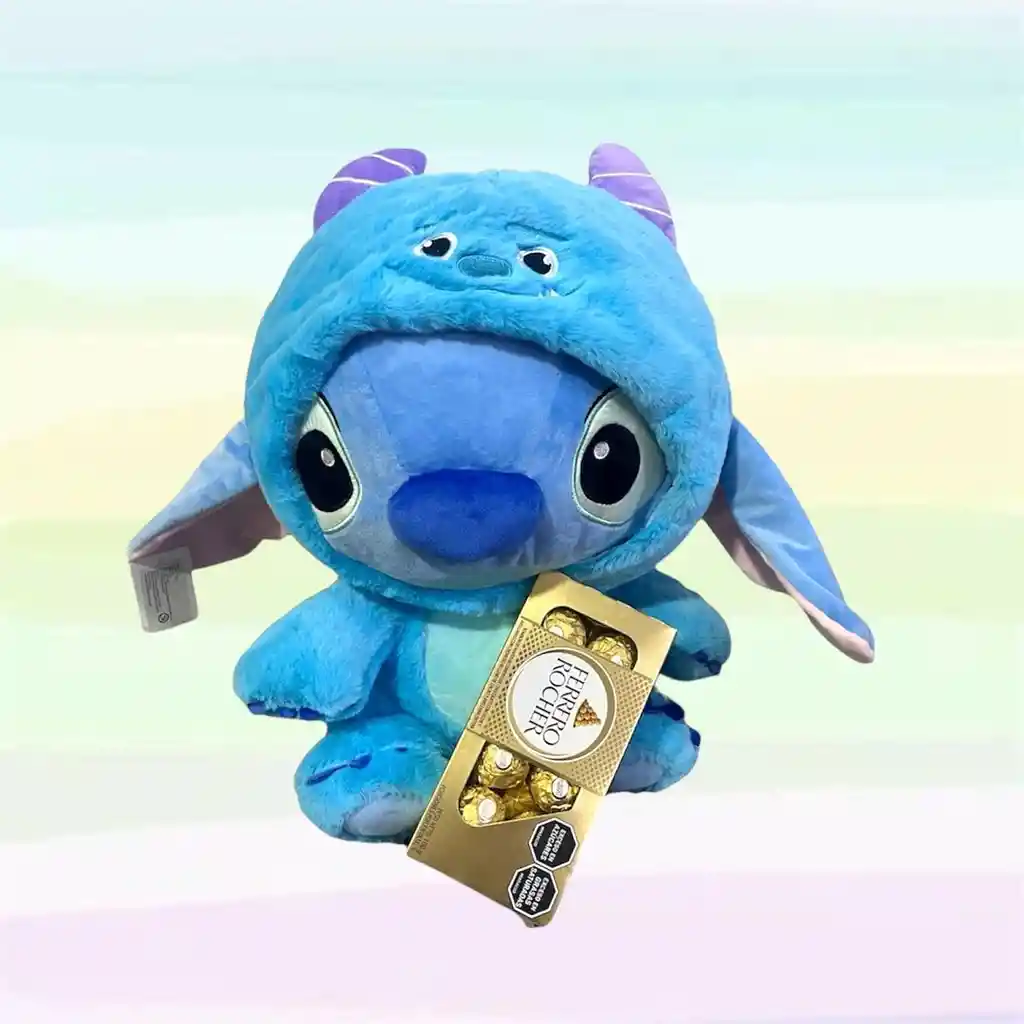 Set de regalo con peluche Stitch disfrazado: Incluye un adorable peluche Stitch mediano con disfraz, acompañado de un paquete de chocolates Ferrero Rocher x8. Un detalle único y dulce para sorprender en cualquier ocasión.