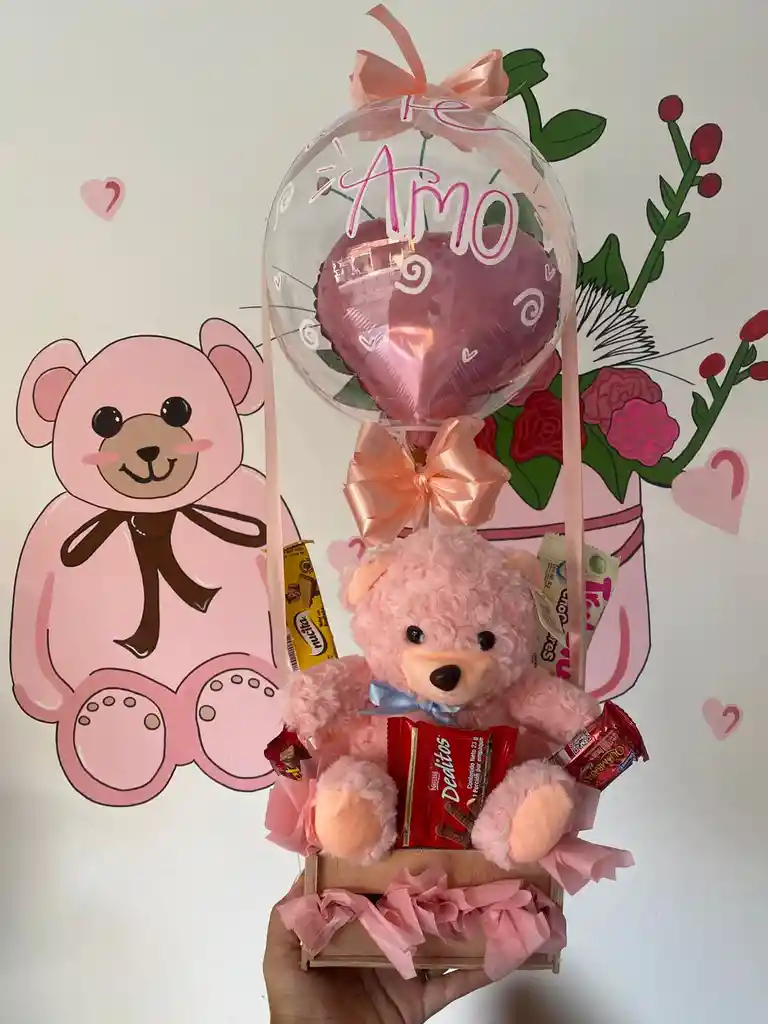 Hermosa ancheta de peluche en forma de oso rosado, con globo englobado de corazón y frase te amo, dulces x5, decoración y mensaje personalizado