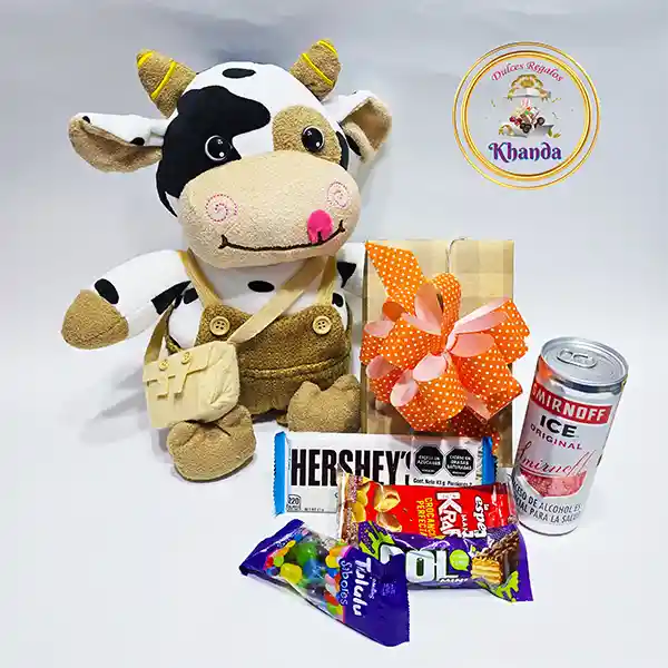 Peluche Toro Hersheys, contiene: 1 Peluche Tipo Vaca con bolso (Peluche tipo vaca, tamaño pequeño, con bolso y saco.) - 1 Lata de Aperitivo Smirnoff Ice Original x 250ml (Smirnoff Ice Lata x 250ml es una mezcla lista para tomar a base de vodka Premium Smirnoff y agua carbonatada con sabor a fresco limón.) - 1 Chocolate Gol Mini (Gol Mini, Galleta Cubierta con Sabor a Chocolate, Caramelo, Arroz Crujiente y Maní.) - 1 Gomas Paquete Trululu Sabores x 35gr (Gomas con Recubrimiento Confitado Sabor Frutal) - 1 Maní Kraks Paquete x 25gr (Maní Recubierto y Horneado.) - 1 Chocolate Hershey's Cookies and Cream x 43gr (Chocolate Hershey's x 43gr, Chocolate Blanco con Galletas y Crema.)